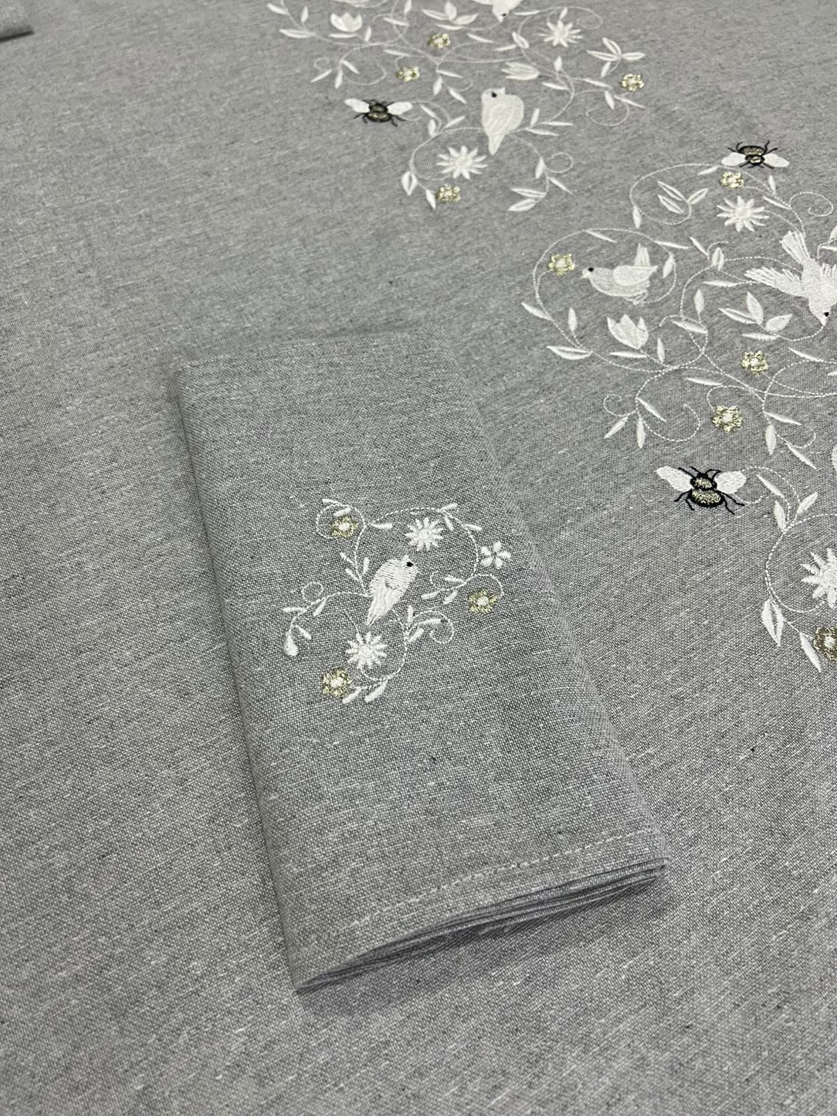 Complétez votre table avec les serviettes assorties, décorées d’un motif brodé discret et harmonieux, en parfaite continuité avec le design de la nappe.